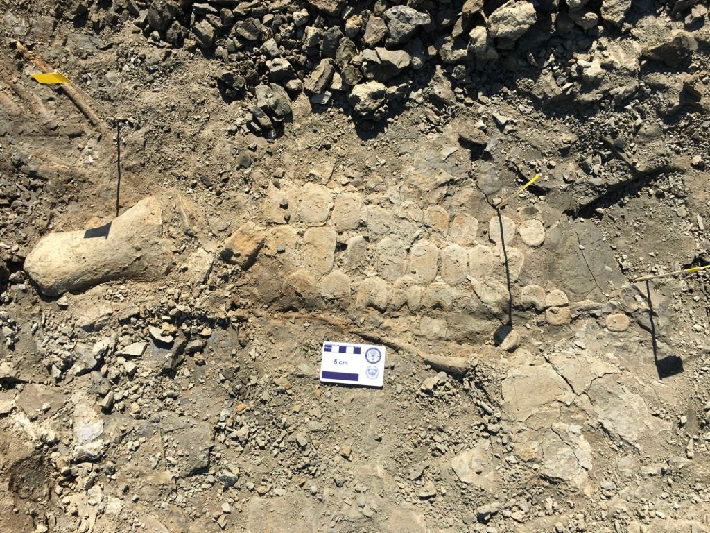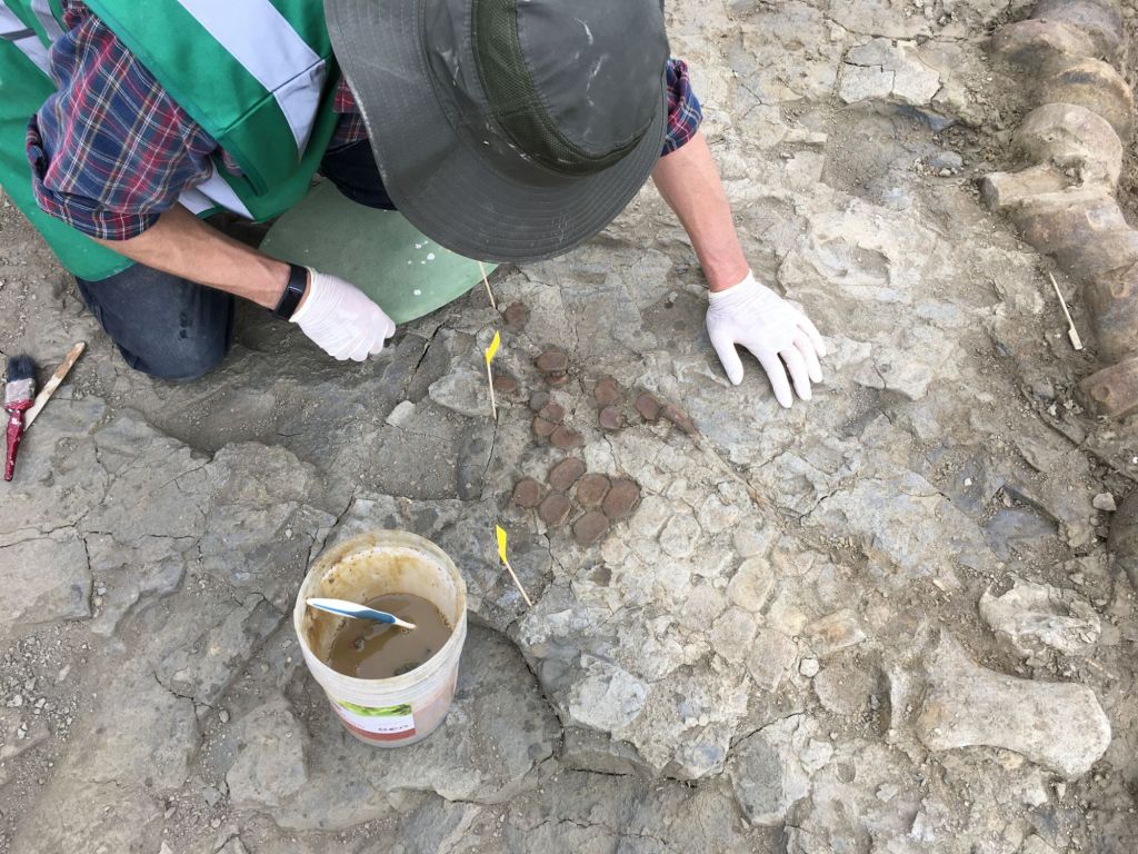 Conservationist Nigel Larkin is seen cleaning the bones of a rear limb from the ichthyosaur using water and a small brush. This cleaning process removes a layer of clay before the skeleton is 3D scanned. Some of the darker bones are still wet, indicating the areas that have been cleaned. Thoroughly cleaning the bones ensures that the digital 3D model will have sharper resolution, allowing elements of the ichthyosaur to emerge more clearly.