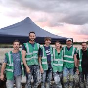 Conservationist Nigel Larkin is seen cleaning the bones of a rear limb from the ichthyosaur using water and a small brush. This cleaning process removes a layer of clay before the skeleton is 3D scanned. Some of the darker bones are still wet, indicating the areas that have been cleaned. Thoroughly cleaning the bones ensures that the digital 3D model will have sharper resolution, allowing elements of the ichthyosaur to emerge more clearly.